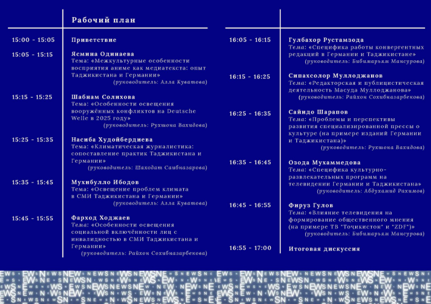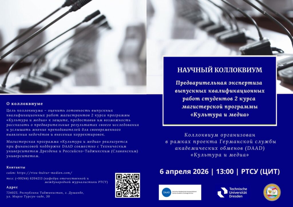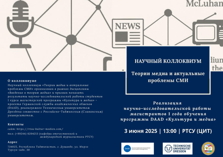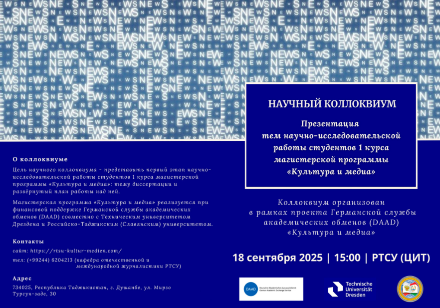 ПодробнееМагистерская программа «Культура и медиа» – это проект Германской службы академических обменов (DAAD), который реализуется в Российско-Таджикском (славянском) университете в сотрудничестве с Техническим университетом Дрездена. Программа коллоквиума
