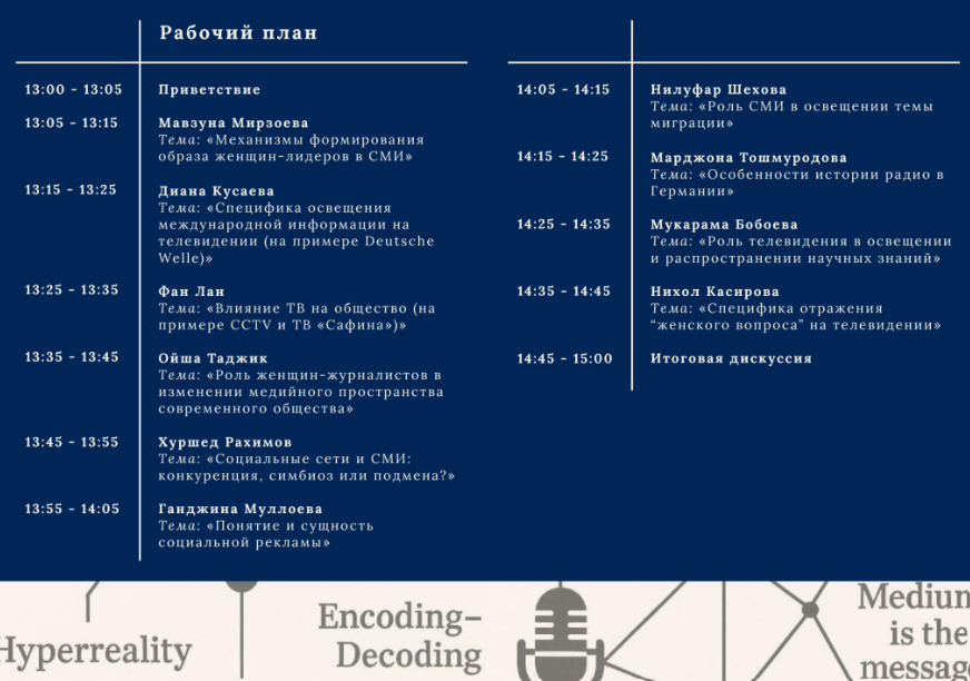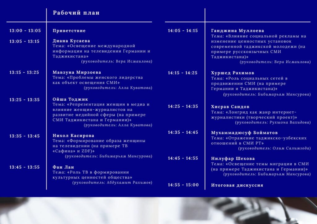 ПодробнееМагистерская программа «Культура и медиа» – это проект Германской службы академических обменов (DAAD), который реализуется в Российско-Таджикском (славянском) университете в сотрудничестве с Техническим университетом Дрездена.