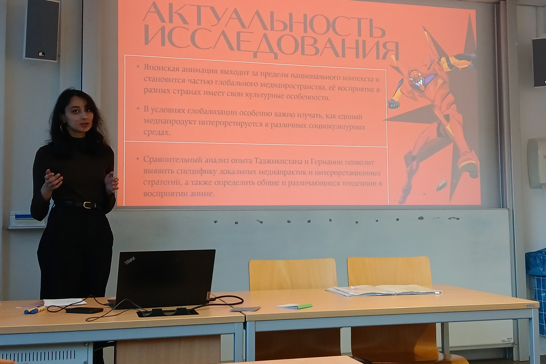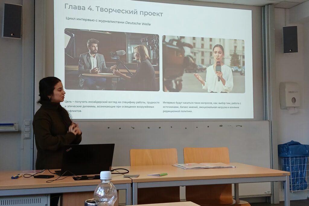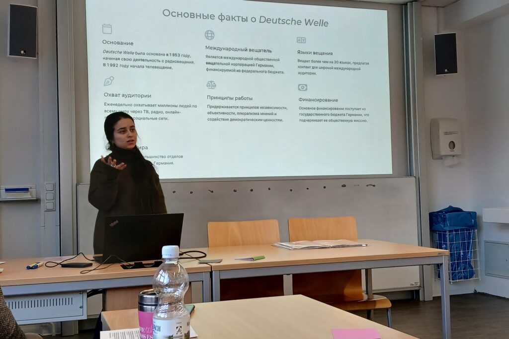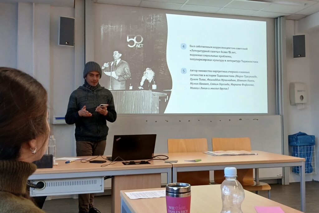 25 ноября магистранты программы «Культура и медиа», проходящие практику в Германии, приняли участие в научном коллоквиуме, организованном профессором Института славистики ТУД – доктором Мариной Шарлай в рамках предмета «Русский язык в контексте культуры». Коллоквиум был посвящён презентации тем научных исследований учащихся. Наряду с магистрантами из Таджикистана свои темы представили и немецкие студенты. Научная встреча дала возможность студентам из двух стран обменяться опытом и знаниями, апробировать свои научные идеи и достижения и получить импульс для дальнейшей работы.